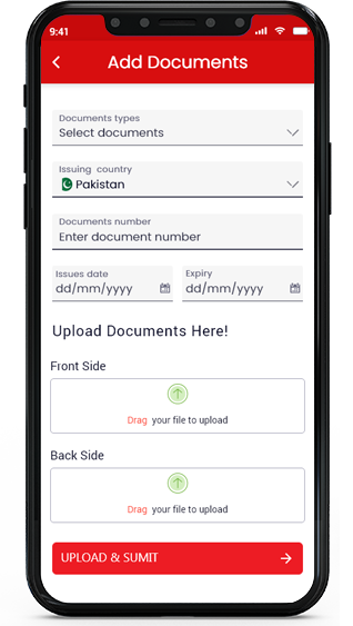 To complete the transaction needs to upload the Identification Documents like ID Card or Passport. Upload valid documents for verification purpose.